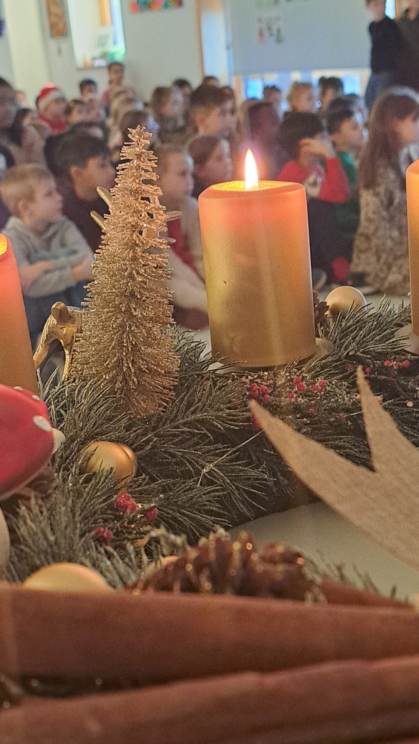 Am 3. Advent präsentierte der Kindergarten St. Vinzent bei uns an der Grundschule im Foyer einen wunderschönen Lichtertanz. Die Kinder hielten kleine Teelichter in den Händen, die den Raum in