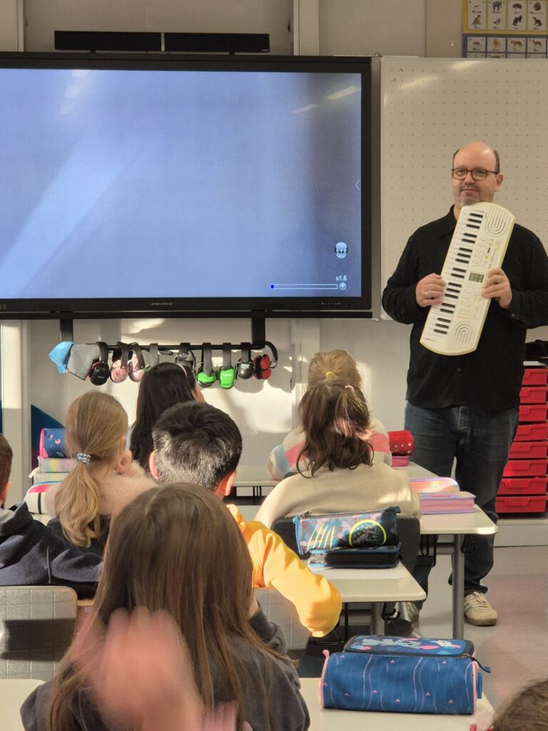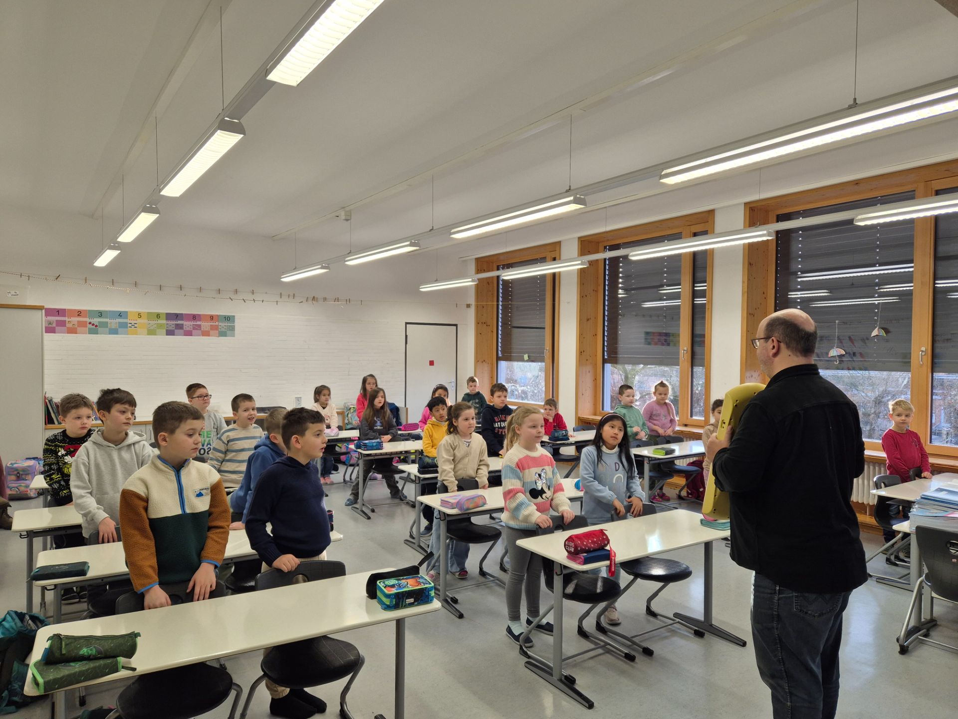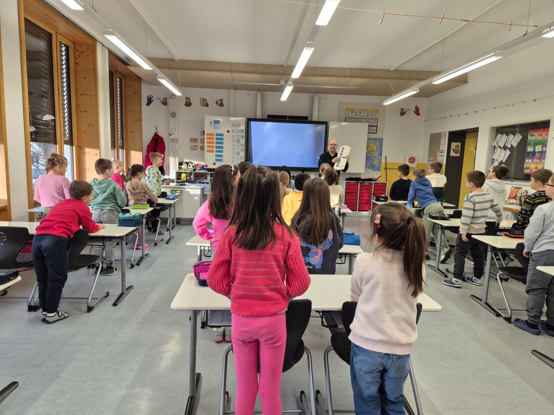 Am 15.01.2026 besuchte uns Herr Fliegner vom Tölzer Knabenchor. Fasziniert schauten und hörten wir ihm zu, wie er auf seinem Keyboard spielte und dazu sang. Besonders schön war es, dass er uns ein kurzes Lied beigebracht hat. Wie ein Chor sangen wir mit ihm: erst alle gemeinsam und dann in kleinen Gruppen. Zum Schluss übten wir das richtige Verbeugen. Da die Lehrer anhaltend klatschten, mussten wir uns ziemlich oft verbeugen.